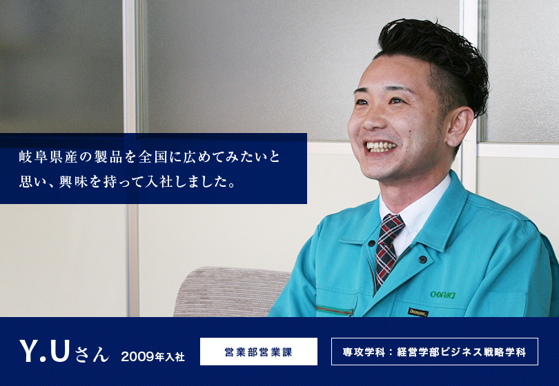 私は地元意識が強く、岐阜県内で働きたいと思っていました。岐阜県に本社・工場があり、そこで製作したものを全国に向けて販売していることに興味があり、岐阜県産の製品を全国に広めてみたいと思い入社しました。